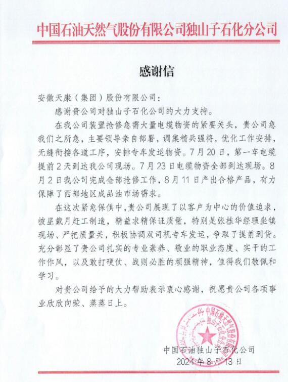 近日,安徽天康电缆收到一封来自中国石油天然气股份有限公司独山子石化分公司的感谢信,感谢安徽天康集团对其装置抢修工程项目的大力支持。