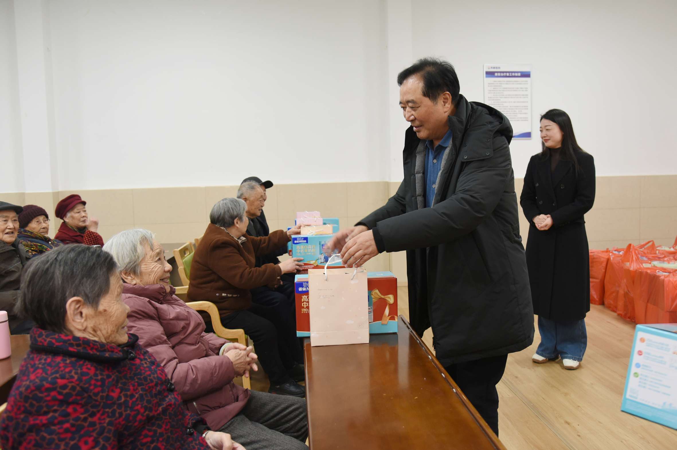 在天康幸福苑,董事长赵宽详细询问老人们的居住感受与服务需求,并亲手送上节日慰问品。他叮嘱工作人员继续提升服务水平,让老人真切感受到“家”的温暖,同时祝愿老人们健康长寿、幸福安康。