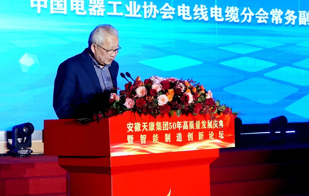 中国电器工业协会电线电缆分会常务副秘书长吴士敏在讲话中表示,50年来,天康电缆在石油、化工、电网、核电、煤矿、船舶、通讯、交通、新能源、智能电网等多个细分市场已占据主导地位,备受客户青睐并得到了行业充分的肯定和认可;天康集团50年的发展史是执着与实干的创业史、奋斗史,是倾注智慧和汗水抒写的华彩篇章,是中国电线电缆行业的成长和发展的缩影与真实写照。