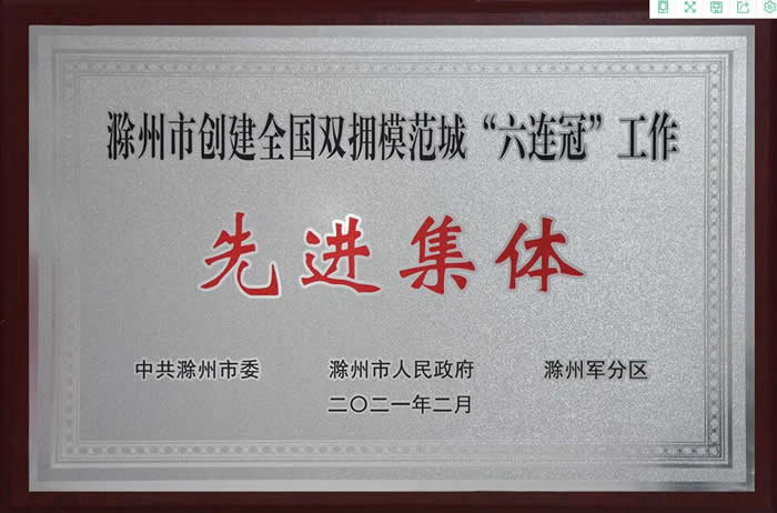 2020年,滁州市以全省第一的优异成绩荣膺全国双拥模范城“六连冠”。为表扬先进、激发干劲,推动滁州市双拥工作再上新台阶,中共滁州市委、滁州市人民政府、滁州军分区决定,对作出突出贡献的先进集体和先进个人予以通报表扬。安徽天康集团获“滁州市创建全国双拥模范城“六连冠”工作先进集体”荣誉称号。
