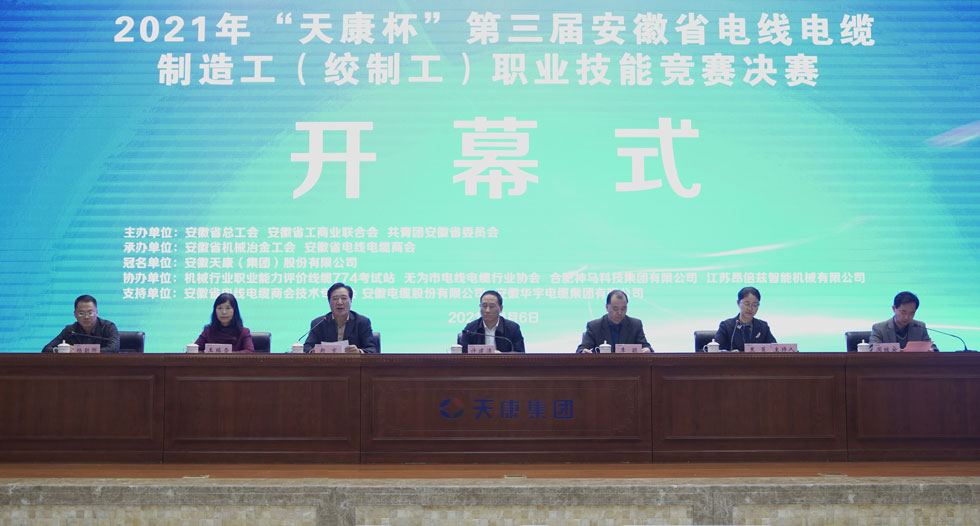 11月5-7日,2021 年“天康杯”第三届安徽省电线电缆制造工(绞制工)职业技能竞赛决赛在安徽天康集团成功举办。省总工会党组成员、副主席许建清,省机械冶金工会主席惠蕙、省工商联会员处处长李颖、滁州市总工会副主席王瑞雪等省、滁州及天长总工会领导亲临现场,天长市副市长周继安,天长市政协副主席、工商联主席杨朝晖,省电线电缆商会会长、安徽天康集团董事长赵宽等应邀出席了决赛开幕式。许建清发表讲话并宣布大赛开幕,周继安、赵宽分别致辞,惠蕙主持开幕式。