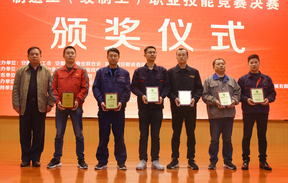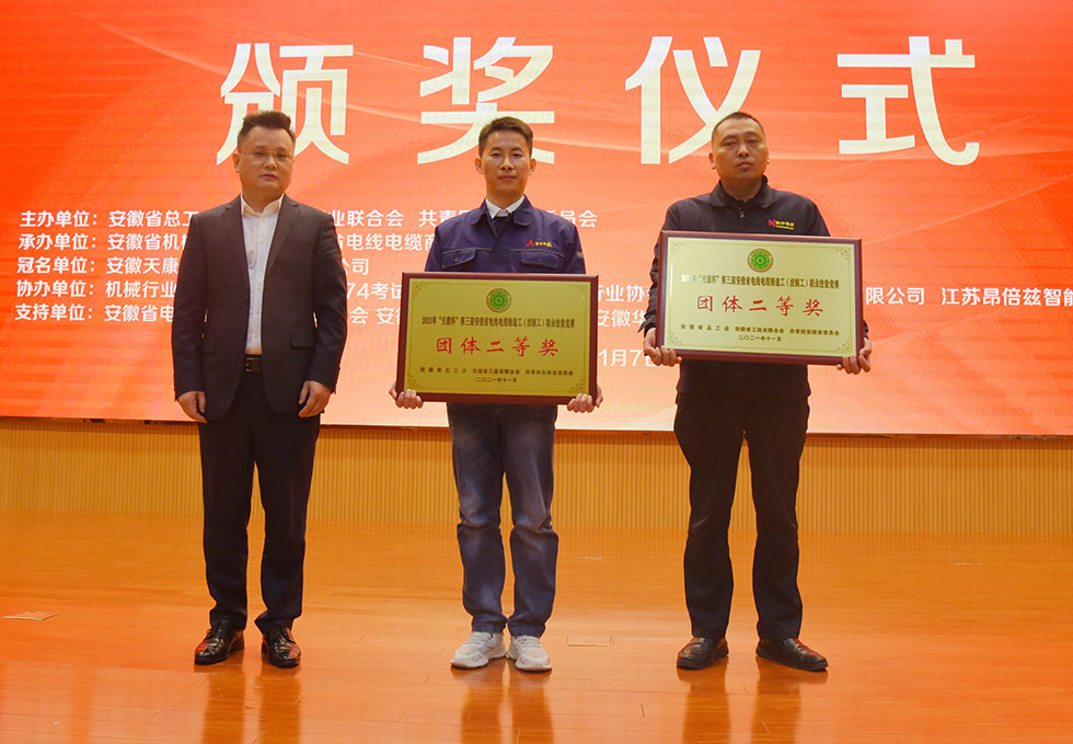 经过为期三天的理论与实操角逐,安徽天康(集团)股份有限公司荣获团体一等奖,安徽华能电缆集团有限公司、安徽徽宁电器仪表集团有限公司荣获团体二等奖,池州起帆电缆有限公司、安徽华菱电缆集团有限公司、安徽太平洋电缆股份有限公司荣获团体三等奖;来自安徽天康(集团)股份有限公司的蒋士虎勇夺个人桂冠,安徽天康(集团)股份有限公司的丁必胜、吴有华、丁元林、李加龙和来自安徽华能电缆集团有限公司的汪开武获得个人二等奖,来自安徽天康(集团)股份有限公司的姜松、张新成,安徽华菱电缆集团有限公司的叶明松、安徽华能电缆集团有限公司的吴本勇、安徽徽宁电器仪表集团有限公司的陈政荣、安徽天彩电缆集团有限公司赵宏春获得个人三等奖。