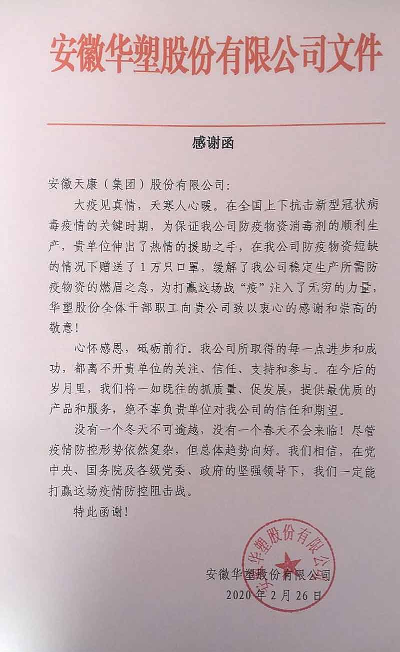 2月26日,一封来自安徽华塑股份有限公司的《感谢函》发至安徽天康集团,对安徽天康集团在关键时刻热情相助表达深情谢意。