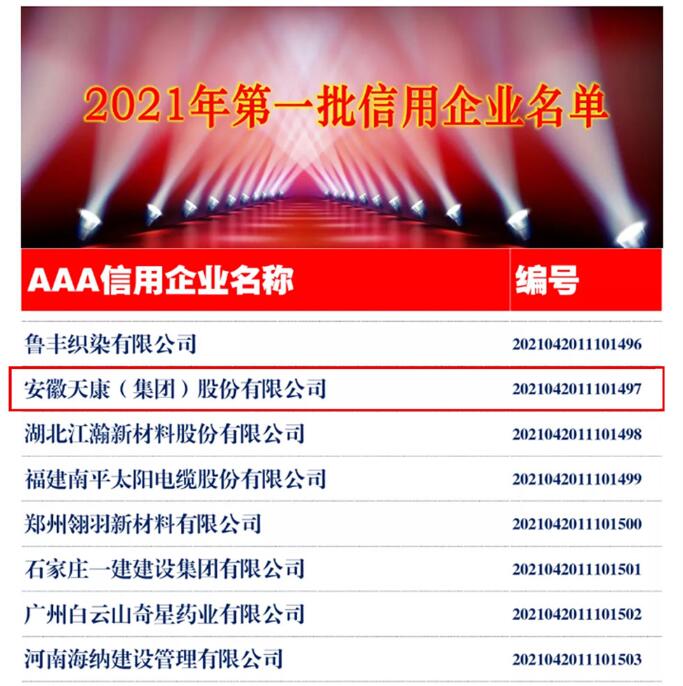 8月11日,中国企业联合会、中国企业家协会(简称:中国企联)发布2021年第一批信用企业名单,安徽天康集团获评AAA级信用企业。